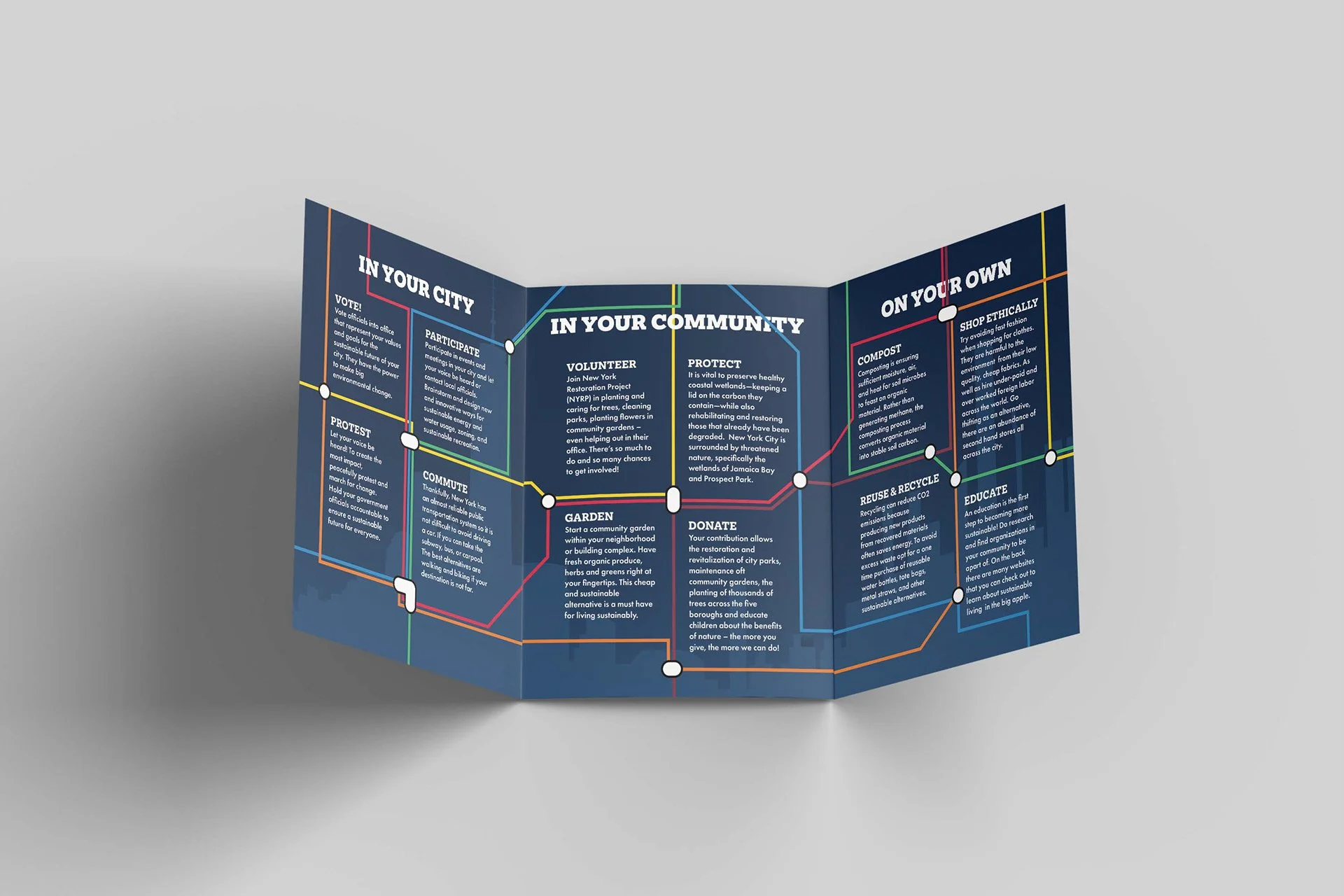 is a brochure that targets New Yorkers with the goal of educating them how to live sustainably within the city. The brochure explores the many ways in which an individual can be environmentally friendly on their own, ways to live sustainably as a community, and what they could do together as one city.